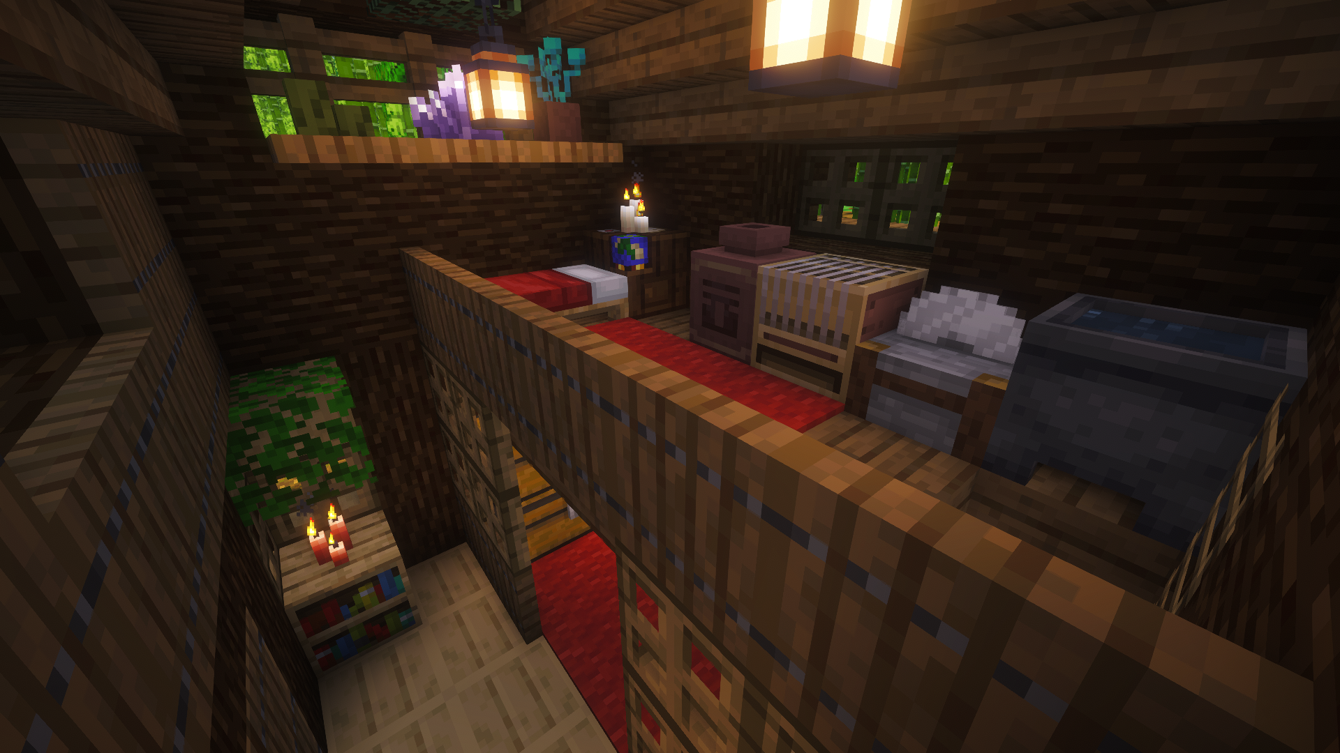 The house has two floors. The lower level includes everything needed for survival, such as crafting and storage. The upper floor features a cozy bedroom.